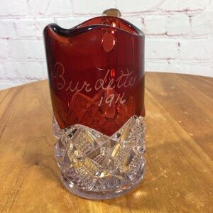Antique 1916 Ruby red flash glass creamer pitcher. The front reads, “Burdette 1916”. This piece measures approximately 4 1/4” tall, 3 7/8” wide including the spout and handle, 2 3/8” in diameter at the base. Great antique condition. No chips, cracks or repairs. Smoke free home.