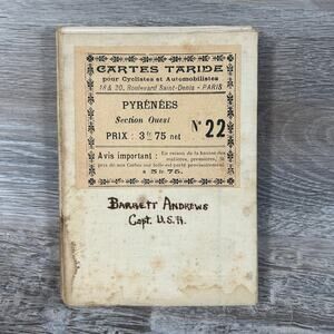 Rare fold-out linen-backed French road map for cyclists and automobilistes by A. Taride, Paris. “Carte Routière pour les Automobilistes & Cyclistes – Pyrénées Section Ouest, No. 22.” Stamped with original owner's name, Barrett Andrews, Capt. U.S.A., adding a layer of historical intrigue.