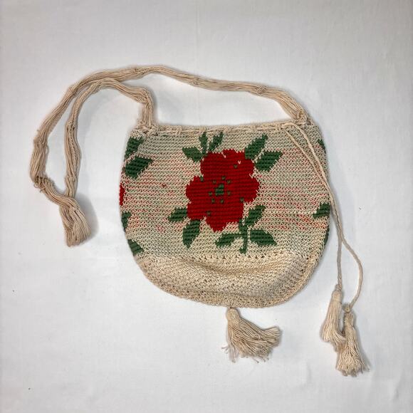 Authentic antique 1920s macrame or crochet bucket purse featuring orange flowers with green leaves and details. It has a long shoulder strap with drawstring closure and tassels.