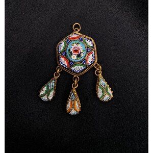 Antique 1920s Made In Italy Micro Mosaic Pendant With Floral Hexagon Design
