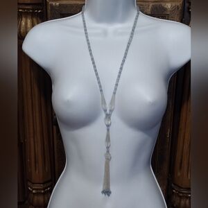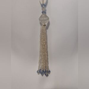 Made of elegant frosted glass beads in white/clear and light blue with delightful fringe tassel.