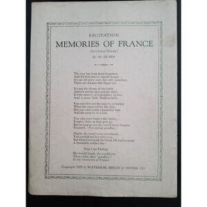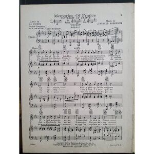 Antique 1928 Memories of France sheet music, Lyrics by Al Dubin Music by J Russe