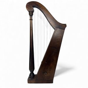 Wind it up with a key and slide switch on interior of harp arm to start the music.
