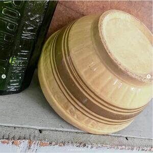 Antique 1930s yellowware mixing bowl with collared rim and pale brown band and double stripe top and bottom.