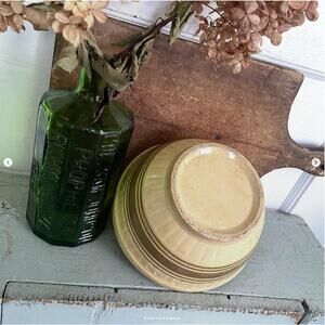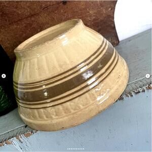 Antique 1930s Yellowware Mixing Bowl Collared Rim Pale Brown Band Double Stripe
