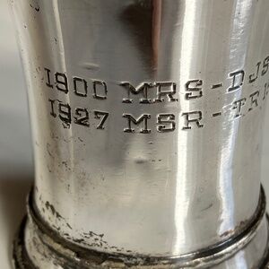 A silver plated cup with this cryptic inscription: