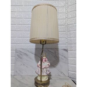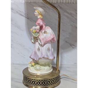 Lovely porcelain lady figurine carrying a basket of flowers. No chips or cracks, figurine in perfect condition. Lamp base in gold tone shows its age. Lamp shade must be replaced! Fantastic piece for that perfect touch of nostalgia!