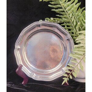 This beautiful antique pewter plate was crafted in the early 19th century. The crowned rose mark on the back indicates that it was made of high-quality pewter by London pewterers. It features a scalloped, "country French" edge design. Approximate measurements: 7 in x 7 in x 0.5 in. Please see the provided photos for further details. (Props not included.)