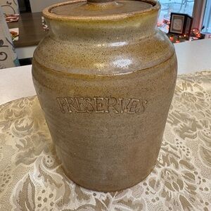 Rustic stoneware jar with 'Preserves' embossed. Perfect for kitchen decor. This is a rare unique jar. Looks like the lid may have been broke and glued back together.Please look at photos