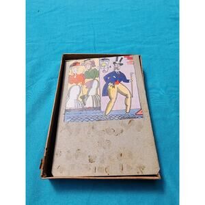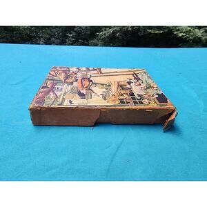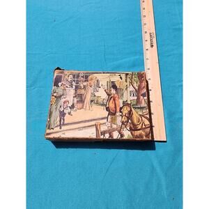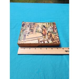 Vintage wooden hand cut jigsaw puzzle. The picture is a Victorian downtown scene. Beautiful condition. Box shows some storage wear including a couple tears. Please see pictures and feel free to let me know if you have any questions.