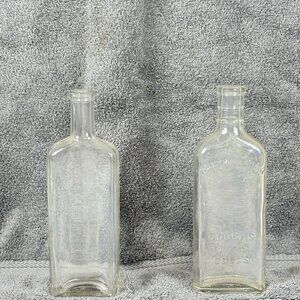 Step back in time with this charming set of two antique glass bottles, with one embossed and the other plain. These bottles tell a tale of yesteryears, evoking memories of old-time apothecaries and remedies. Their rectangular shape and clear glass make them versatile as both decorative pieces and collectors' treasures. Relish the touch of craftsmanship in the embossed details, while the other bottle's simplicity radiates understated elegance, whispering stories of the past.