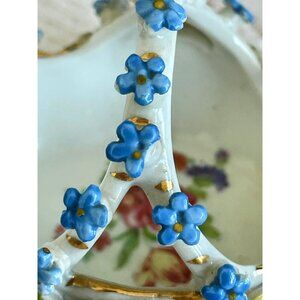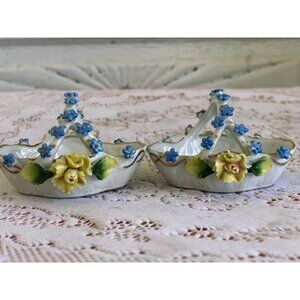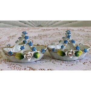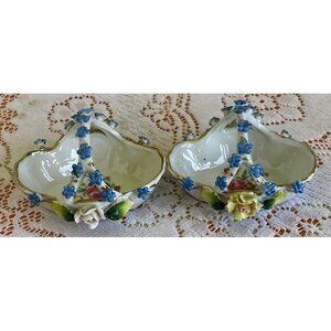 Antique 2 Porcelain Rose & Forget Me Nots Trinket Basket Elfinware Floral German