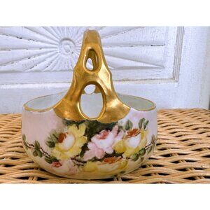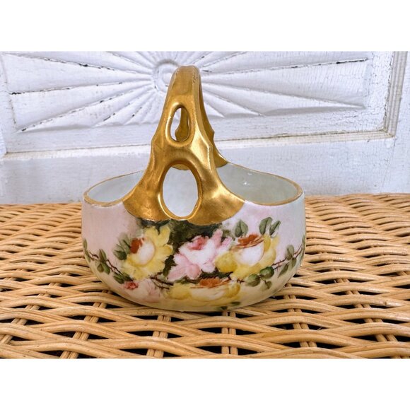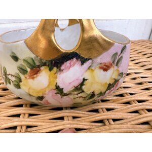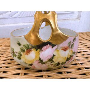 Antique 30's Austria Hand-Painted Floral Porcelain Basket With Gold Handle