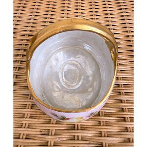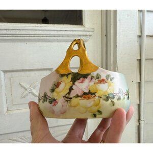 This exquisite antique hand-painted porcelain basket showcases an elegant floral design with delicate roses and a striking gold handle. Crafted with meticulous detail, it serves as both a decorative piece and functional vessel for holding small items. Its timeless appeal adds a touch of antique charm to any setting. This measures a diameter of 4.5" and is 2" deep. This is in very good condition. The painting is still very bright and not worn. No chips or cracks.