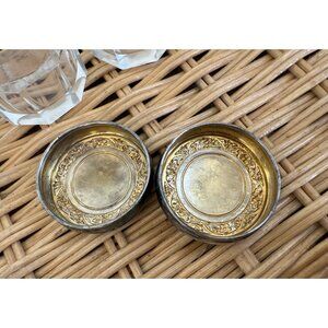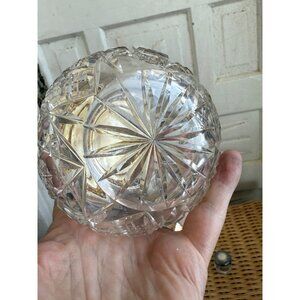 This exquisite set of three antique vanity jars features cut crystal designs with floral motifs and sterling silver tops by Wallace. Perfect for collectors and vintage decor enthusiasts. The large pot measures about 3.5" tall and the little jars are about 1 1/8". I did polish a little the tops to check for damage and hallmarks The larger jar does have a little ding in it. These could use a little more polishing. There are no chips or cracks. Overall a nice little antique set. There is the Wallace Hallmark on the bigger jar.