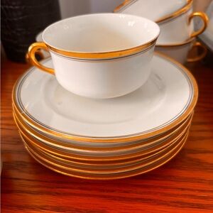 Complete set of 6 tea cups and matching saucers manufactured sometime between 1890-1930 by GHB Co and distributed as Cleveland China to high end department stores. Cleveland China was operated by George H. Bowman who declared himself an exporter of high end goods. Each teacup is marked as Narcissus Warranted 18 Carat Gold" and each saucer is marked "Narcissus Warranted 18 Carat Gold Cleveland China G.H.B.Co. This set is just absolutely beautiful. Each handle has been dipped in 18 carat gold and are absolutely elegant.This is a marvelous set if you appreciate the simply elegant design of the set.