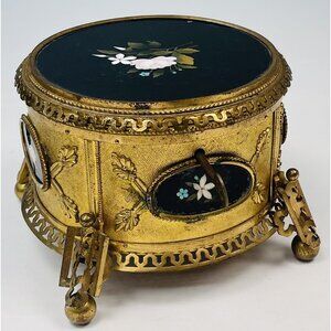 Antique 6.5" Pietra Dura Micromosaic Round Gilt-Bronze JEWELRY BOX w/ Velvet Key