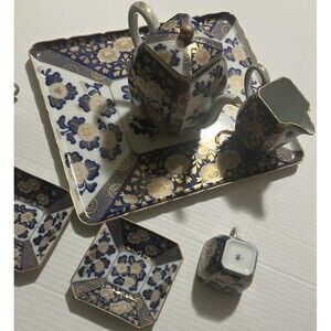 The Antique 7 Piece Fukagawa Koransha Cobalt Blue and Gold Gilt Tea Set with Platter is a stunning set originating from Japan in the late 19th century. Made of porcelain and pottery, this tea set features intricate cobalt blue and gold gilt designs, making it a beautiful and unique addition to any collector's inventory. The antique original pieces showcase the craftsmanship and artistry of the era, making it a valuable and sought-after item for those interested in Asian antiques.