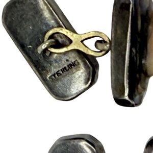 Elevate your formal attire with these Antique 925 Sterling Silver Men's Cufflinks, showcasing a timeless rectangle design. The striking multicolor Mother of Pearl/Abalone inlay adds a splash of elegance and sophistication, complementing any ensemble. With dimensions of 0.55" x 0.30", these cufflinks are crafted to make a statement without overwhelming your shirt cuff. Crafted with precision, the cufflinks feature a chain link style that ensures a secure and comfortable fit. The natural creation of the main stone speaks to the uniqueness of each piece, while the sterling silver base metal purity reinforces their quality. Perfect for any vintage aficionado or discerning gentleman, these cufflinks are a versatile addition to any collection.