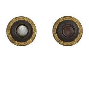 Antique A.P & Cie Paris shank buttons have mother of pearl (?) round inset in center that are surrounded by a dark maroon exterior. This is mounted on a gold tone metal shank button.