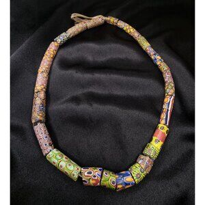 This striking necklace is composed of antique African trade beads, often known as Venetian Millefiori beads, dating back to the 19th to early 20th century. These beads were handcrafted in Venice, Italy, and traded across the African continent in exchange for goods such as gold, ivory, and textiles. Each bead carries a story of global connection — from European glassmakers to African merchants and artisans.