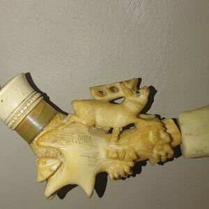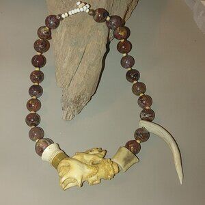 Antique Agate Bead Necklace Carved Antler Pendant Deer Elk Artisan Craft Rustic