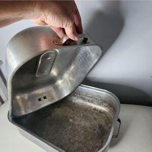 This antique Royal Chef roaster is a true gem for any kitchen collector. Made of durable aluminum and sporting a stunning silver color, this three-piece set includes a lid and steamer basket for your convenience. The oval shape and vintage design add a touch of elegance to any countertop.