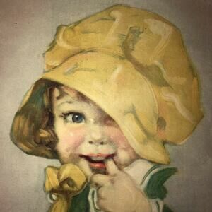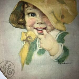 Vintage Ann Brockman GE Ad Print 1930s Original Frame. Condition is Used. In original metal oval frame. Print is of adorable little girl with yellow hat. Ann Brockman was an American artist 1899-1943. Frame: 10”x8” oval. Print: approximately 8.5”x7.5”