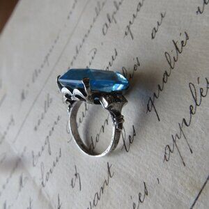 This is such a pretty antique (it was my grandmother's) ring with an aquamarine stone in a sterling silver setting. It's a size 5.5 or 6 (the band has a little bending) and could use a cleaning. It comes from a smoke-free home (although we do have dogs) and is in as is, as found condition.