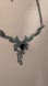 Art deco necklace in a stunning scrolling design that sits close to the neck. Made with sterling silver and onyx this dramatic necklace will twinkle with its spattering flappers diamonds or marcasite. Flattering design has three dangling charms that flicker and twinkle as you move. This unique design is held with a double chain and a spring ring clasp. stamped .925
