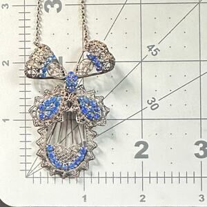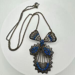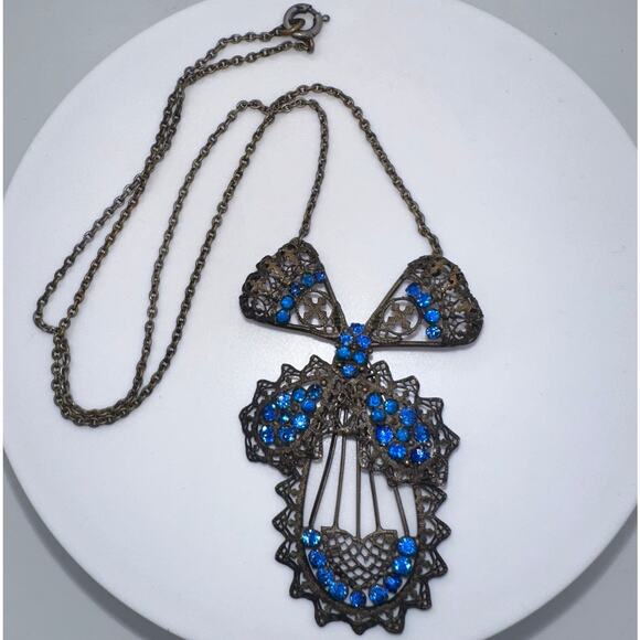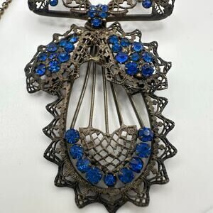 Excellent antique condition, a few rhinestones appear slightly wonky in their settings but all are guaranteed secure and brass hardware shows a gorgeous patina. This intricate piece features an articulated pendant with all hand-done filigree and prong-set blue Czech rhinestones. Length is 18”. Clasp functions perfectly. Please see photos for pendant measurements in inches.