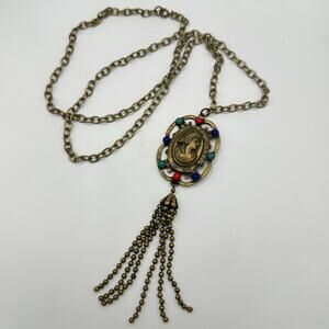 Antique Art Deco 1920s brass multicolor glass cameo tassel pendant necklace