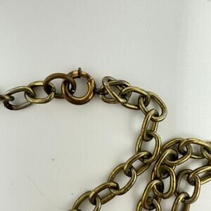 Excellent antique condition, gold tone brass shows a gorgeous patina throughout. Extra long pendant features a tassel of ball chains and multicolor glass cabochons in red, blue, and green that easily mimic semiprecious gemstones. Chain length is 32.5" long and approx. 0.25" wide. Clasp functions perfectly. Please see photos for pendant measurements in inches.