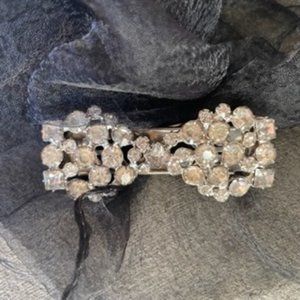 Lovely large Gatsby style duette brooch w beautiful smokey-clear faceted round stones in 2 different sizes paired with princess cut foiled stones. All stones are prong set in a silver tone setting. Can be worn as a single brooch with pin and rotating safety or as a duette brooch (double clip brooch). Measurement is 4-1/4" inch long x 1 inch at its widest point . Marked Pat.Pend. Rollover pinback clasp is in good working order and hinged clips are nice and tight. Nice Vintage condition with patina consistent of a pre-owned piece of its nature and time, created during the Art Deco era, 1915-1935.