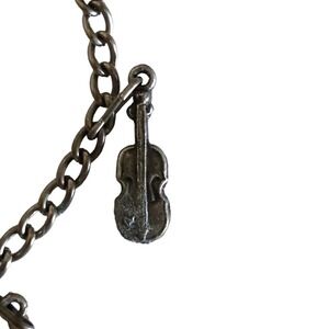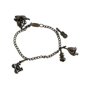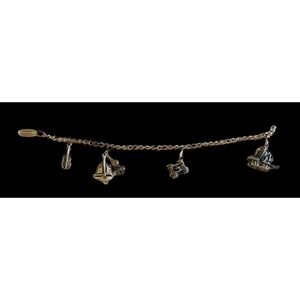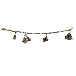 Antique Art Deco Metal Charm 7.25” Bracelet 5 Charms Ships Violin Binoculars