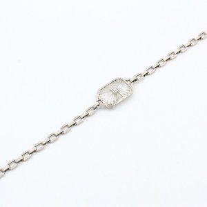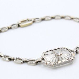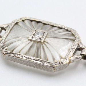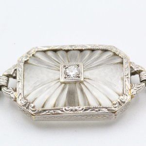 The 20mm by 12mm dimensions of the frosted rock quartz crystal center add a touch of opulence to this stunning piece. The entire bracelet is marked with a discreet yet significant "14K," affirming the premium quality of the white gold. With its tasteful combination of sparkling diamonds, frosted crystal, and sleek white gold links, this antique Art Deco bracelet is a wearable masterpiece that effortlessly captures the essence of the roaring twenties' timeless style and luxury.