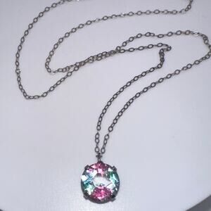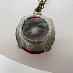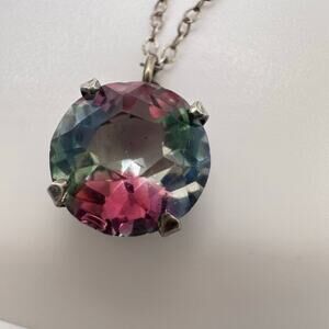 Excellent condition, shows only hints of oxidation. Gorgeous unfoiled iris glass is clear with a gradient of pink, mint green, and pastel blue. Sterling silver chain is vintage and measures 15.75" and clasp functions perfectly. Please see photos for pendant measurements in inches.