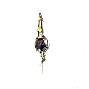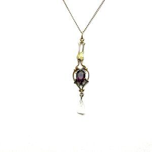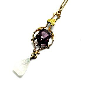 This exquisite Art Nouveau pendant captures the movement's signature organic beauty with its intricate leaf metalwork and rich purple and pearlescent glass stones. The delicate craftsmanship showcases period attention to detail, from the flowing botanical motifs to the carefully prong-set amethyst-colored glass that catches light beautifully. At just 2.5 grams, this piece embodies the ethereal quality that made Art Nouveau jewelry so revolutionary.