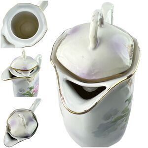 This set was crafted from 1909-1916,and is comprised of 6 demitasse cups and a matching pot with lid all made from high-quality porcelain. Adorned with a beautiful floral pattern with the front and back featuring different themes.