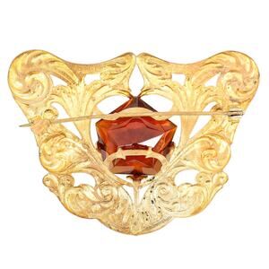 Antique Art Nouveau Gold Wash Brooch with Large Amber Glass Stone