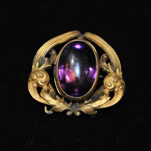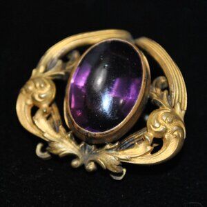 This is a beautiful Art Nouveau style brooch with a loop for a watch or watch chain. The pin features a rather large piece of cut amethyst glass that is smooth on the front. There are some areas where the matte gold-plating has worn away. Overall, the piece is still in very good shape.