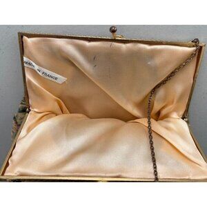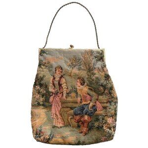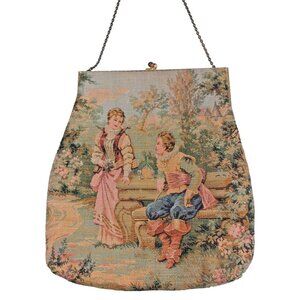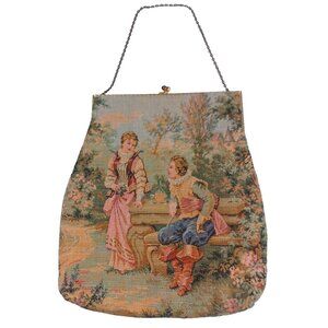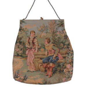 This is an antique Aubusson tapestry purse from France, featuring a courting couple design. The purse has a kisslock closure and is made of tapestry material with a lovely pink satin lining. It has a distinctly Victorian style and is a handmade original piece from the early 1900s.