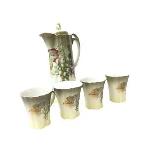 The Beautiful Barvaria A&C Chocolate/Teapot Set is a vintage porcelain set with a floral pattern, perfect for tea parties during Easter or spring. This original 1950s style set includes a medium-sized teapot and 4 cups, making it ideal for serving tea or hot chocolate to guests. The multicolor design adds a touch of charm to any occasion, making it a lovely addition to any collection of dinnerware and serveware.