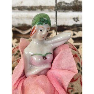 Antique Bathing Beauty Type pincushion Half Doll On Chair Legs out Japan