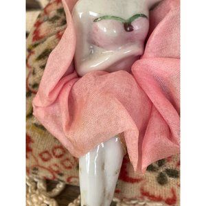 Here for your consideration is a nice antique bathing beauty type pin cushion half doll. She has a silk dress and is sitting on a velvet chair. The chair is 2.5" wide and 2" tall. The doll is about 4" tall. This is in very good condition. There are no chips or cracks . The dress has some yellow aging but no holes. I have several half dolls in my listings if you are interested in more.