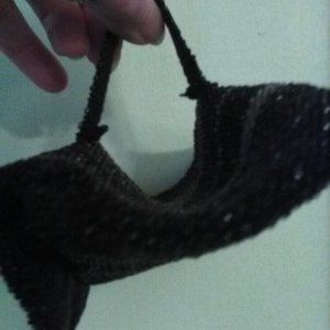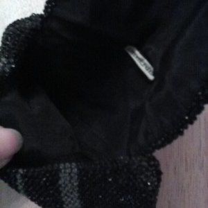 Antique Black and Clear Beaded Cloth Coin Purse. Snap Flap Closure. Measures approximately 6" wide by 3 3/4" tall and 1/4" deep. Strap on the back of the bag fits over a small hand. Unless a very tiny hand and wrist it will not fit over a wrist.