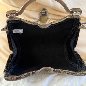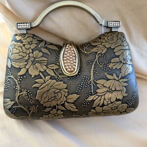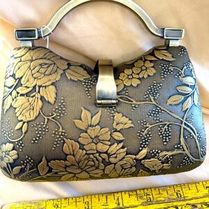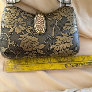 This Anthony David evening bag is a stunning accessory for formal occasions. It features a flower pattern with crystal accents on a bronze/ Golden flowers on blackish base exterior made of metal and faux leather. The top handle and bronze hardware add to its elegant design. The bag's dimensions are 7.5" in length, 6.25" in width, and 2.75" in height, with a depth of 2.25". Perfect for adding a touch of antique beauty to any evening outfit.
