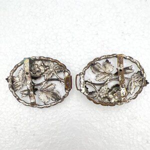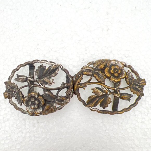 Elegant vintage brass belt buckle featuring a floral motif with intricate leaf and flower designs, perfect for collectors or historical wardrobe accessories.