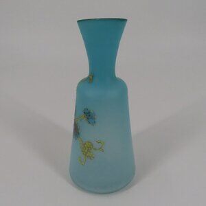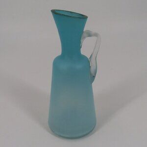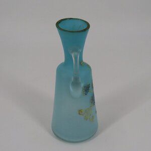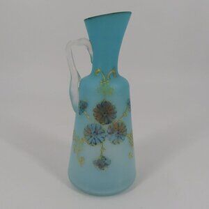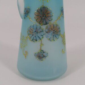 Antique Blue Satin Glass Gold Flower Floral Cruet Dressing Pitcher 6.9in Country
