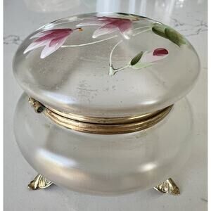 Beautiful round Bohemian Trinket Powder Box is hand-blown glass with a brass hinged lid, featuring a lotus flower pattern on clear, almost slightly frosted or satin glass with scroll-worked brass feet. Made in Czechia during the early 20th century, this antique trinket box showcases a Victorian style and hand-painted floral enamel decorative elements. Its unique design and bohemian theme make it a charming and collectible piece for those who appreciate art glass and intricate floral patterns. The box measures 3 inches in diameter.